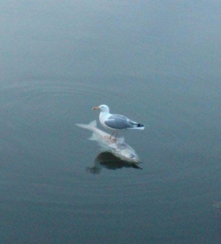 How often would you see a seagull resting like this on the top of a fish in the middle of the ocean? This seagull is having a good time getting some rest and we cannot stop admiring the balance and the skills the bird has for this.