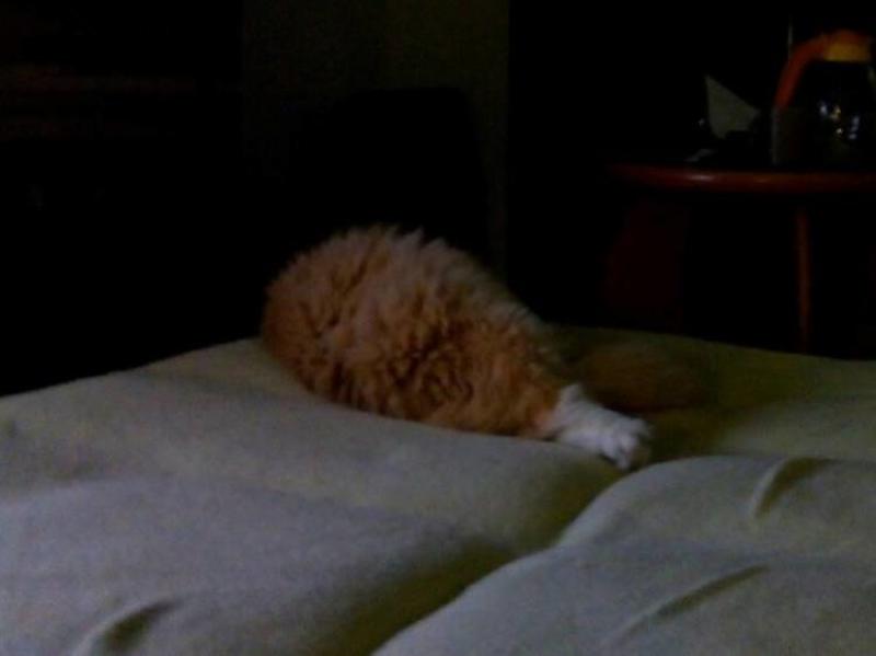 This cat sleeping looks purrfectly like a chicken drumstick that you love from KFC. This cat seems cuddled up in such a way that it has one paw sticking out that makes it seem like there is a drumstick on the bed.