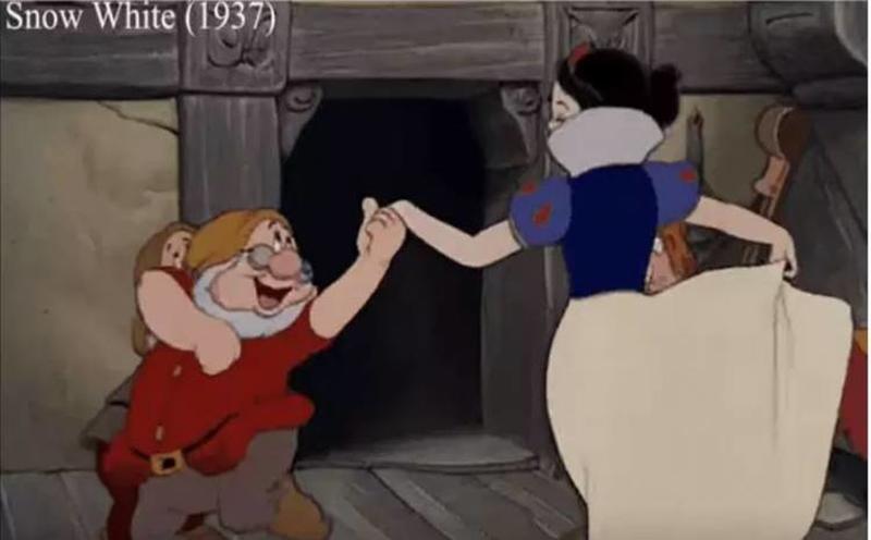 This scene of Snow White playfully dancing with one of the 7 dwarves was a fun scene in the 1937 Disney film version of Snow White. The animation here would be used again in a later Disney project, as we're about to show you.
