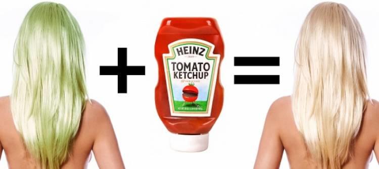 Some women (and indeed some unprofessional saloons) don't have much in the way of professional finesse and are unable to dye their hair properly. Sometimes they end up having a green tinge. The solution is simple, spread a few tablespoons of ketchup on your hair and leave for 30 minutes.