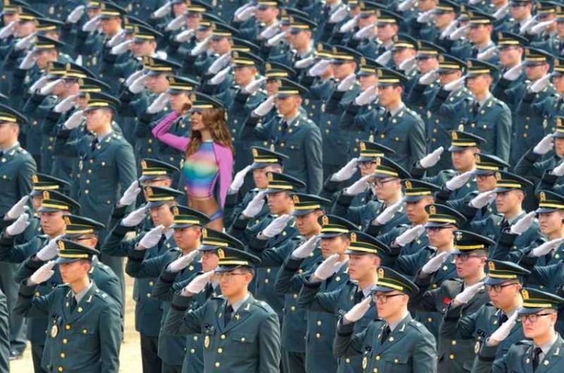 Here's another example of someone deciding to think outside the box and use the fact that she is looking out at something to create a hilarious image. Here, they put her next to a group of saluting soldiers and she would probably not stand out as much if not for the rainbow pattern!