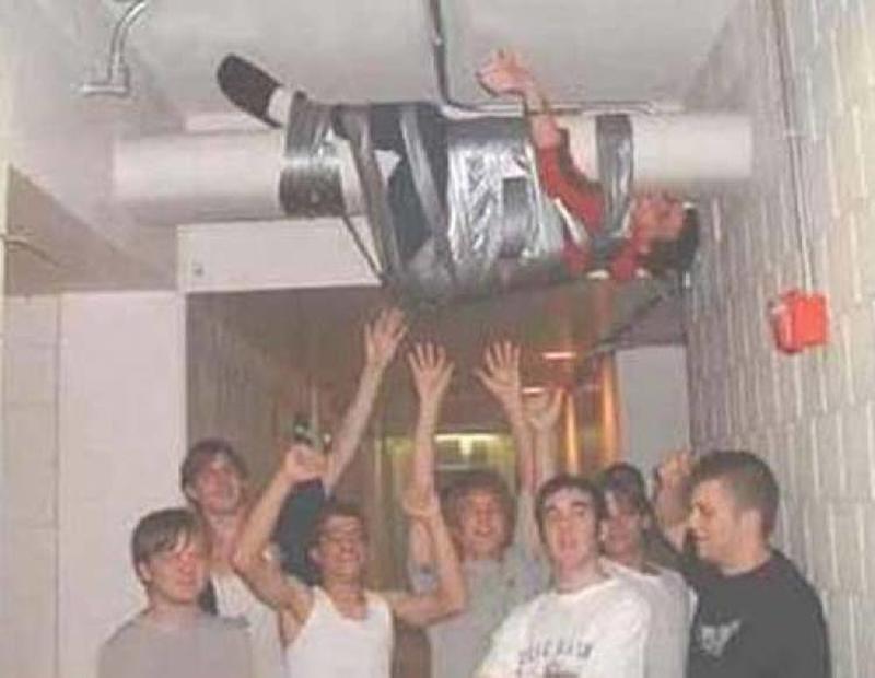 Have you ever wished you had the powers of a super hero? Specifically, Spiderman's super stickiness? Thought you needed a fictional spider to bite you, but look no further this alcohol fuelled genius has solved your problem. And all you need is tape and drunk friends.