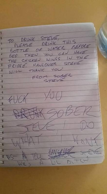 They say talking to yourself is the first sign of insanity, but they also say that to become a genius you must become a little crazy. Steve was just trying to look out for himself, he knew what he was going to get himself into and decided to plan for it. Unfortunately, drunk Steve saw things differently.