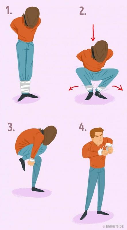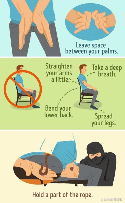 We certainly hope you never find yourself in such a situation before, but there is a way out of you play your cards right. Stand straight up and put your feet in a V position, now jump and spread your knees. With your hands tied behind your back, move forward and spread your hands to the sides very quickly.
