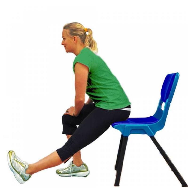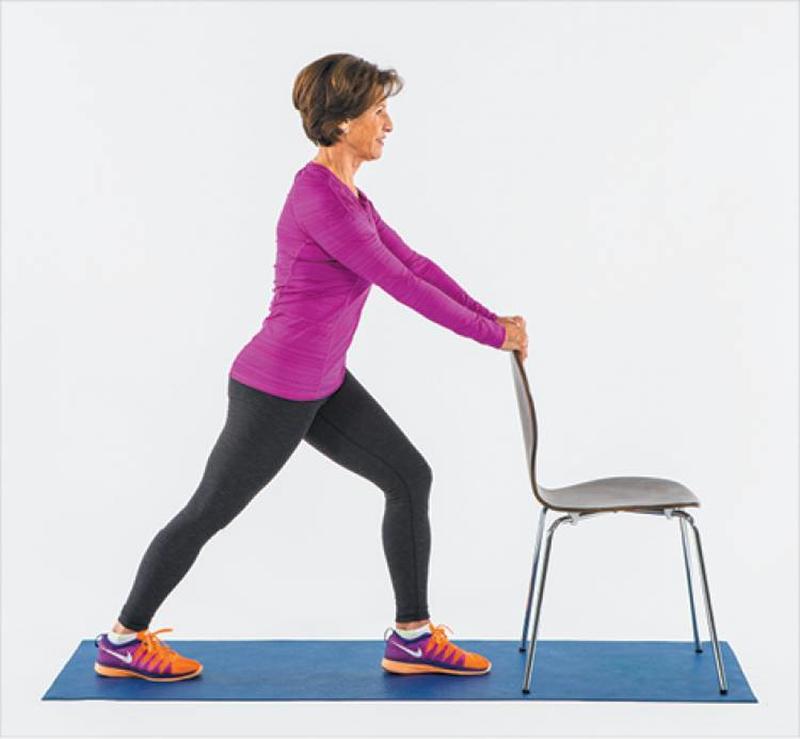 While facing the back of your chair, put one leg straight behind you while the other right in front of you and slightly bent at the knee. Now place your hands on the top of the chair for grip. Lean your torso toward the chair. Hold for a few seconds and switch the legs. Repeat for about a minute.