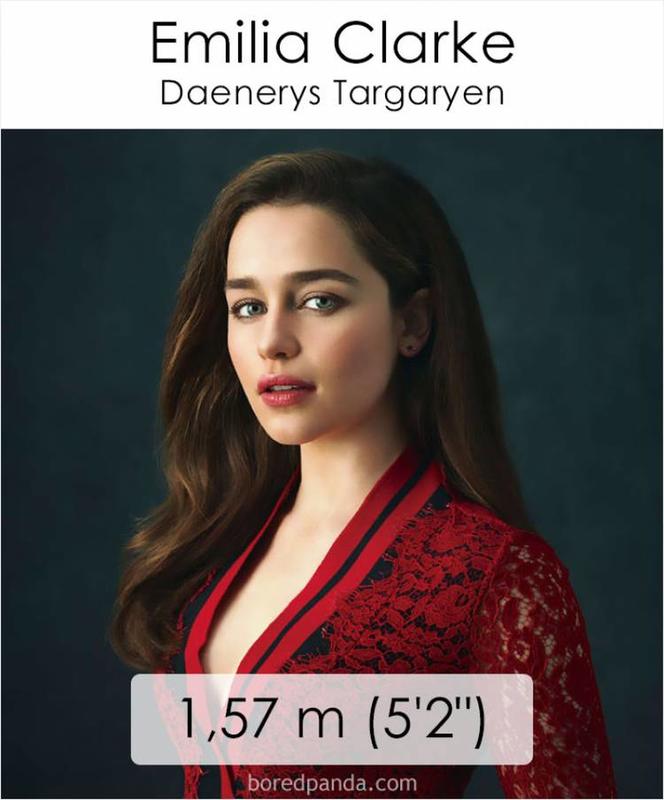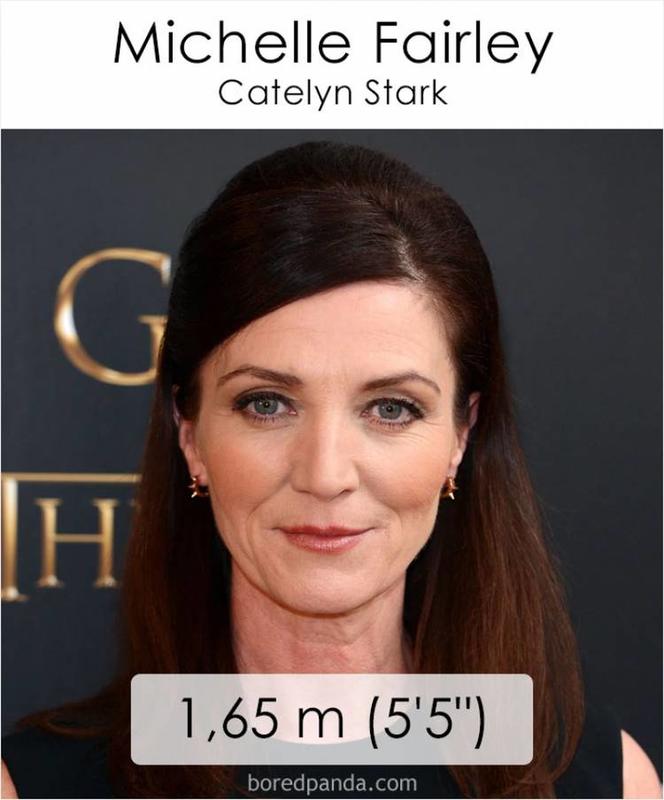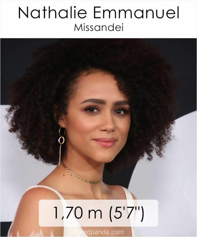 You probably didn't expect young Maisie Williams to be the second shorter character, but here she is - standing at a minuscule 5'1", which is 1,55m. This is slightly less than the average female height in Europe and the US, interestingly.