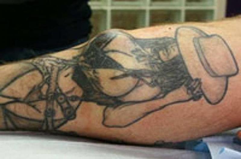 Here is a weird one. This guy wanted to have a cowgirl, with cleavage and boobs tattooed on his arm - nothing strange there. But what he did next is kind of shocking - he had various stuff inserted under his skin, so that that boobs "pop-out" and appear 3D.