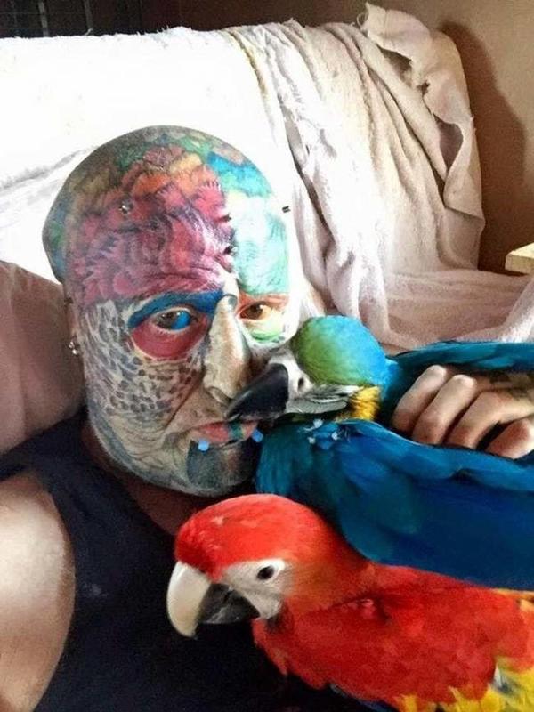 Here is guy that loves animals, especially his pet parrots. Maybe he loves them too much, as he changed his entire look so that the also looks like a parrot. It is just sad that computer technology isn't advanced enough to make him be able to talk to the parrots.