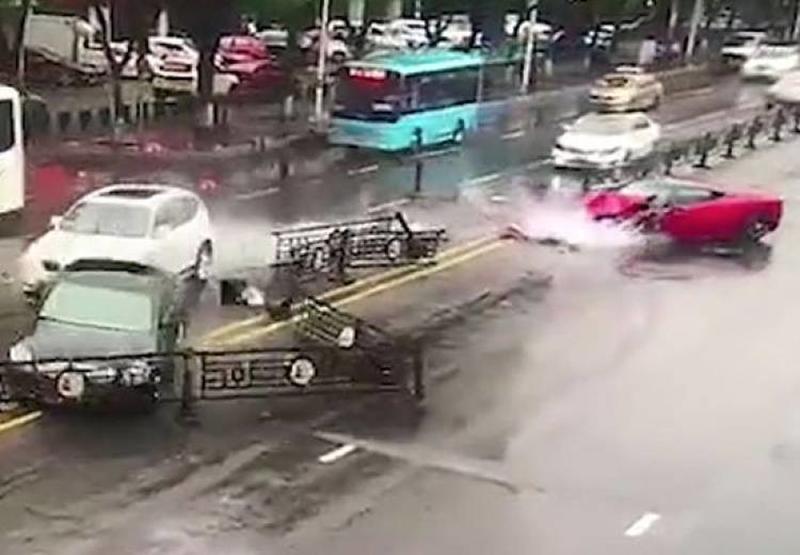 After the Ferrari went through the barrier and into the oncoming lane, it crashed into the SUV, and then came to a complete stop. It isn't known whether the car engine was wrecked, but it can be seen that the car is not moving after the crash. The video seen here has been uploaded by traffic cameras in the busy city center, and the vehicle can be easily seen swerving out of control. New vehicles made in the past decade or so have ESP (electronic stability control), so it not known why the Ferrari lost control on the wet asphalt like that.