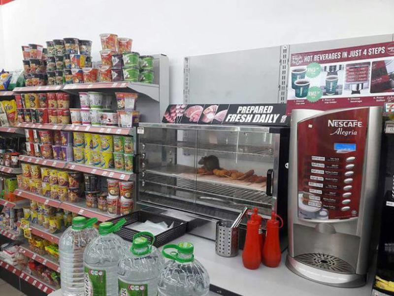 This is why you should always be careful about where you buy food. Photos like this can scare you out of ever wanting to eat in public again, and maybe they should. This rat has free roam in that cage--think about all the people who ate from there! Gross!