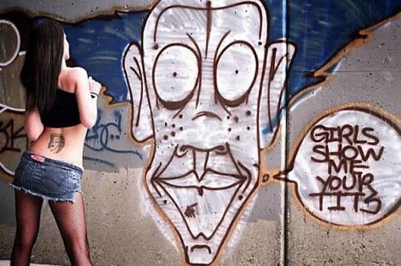 It's weird because whoever wrote this graffiti definitely didn't believe someone would follow the instructions of this cartoon guy. However, this girl decided to break all the rules and it makes for a hilarious photo, and one that doesn't require context.