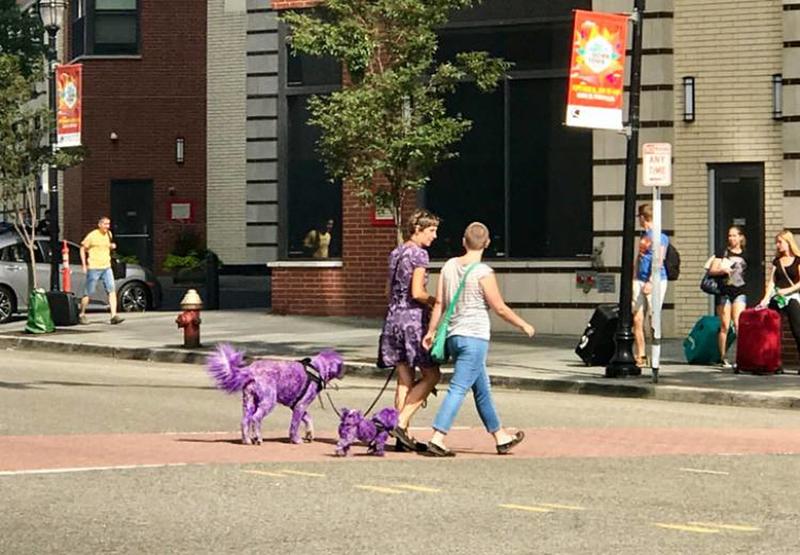 This is pretty darn bizarre. You don't always see dyed animals--or, you hardly ever see dyed animals. Here, both the woman's pets are painted purple for some reason. To make things weirder, she herself is dressed in the same color!