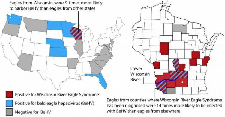 Scientists at the University of Wisconsin-Madison originally were looking for a cause for Wisconsin River Eagle Syndrome which is a disease affecting eagles around the lower Wisconsin River. In looking for the cause, they found a ner hepacivirus, also known as BeHV, that may be causing the disease. The Wisconsin River Eagle Syndrome causes seizures and makes the eagles stumble. That could affect the way the eagle hunts, as well as cause it to fall out of the sky and die.