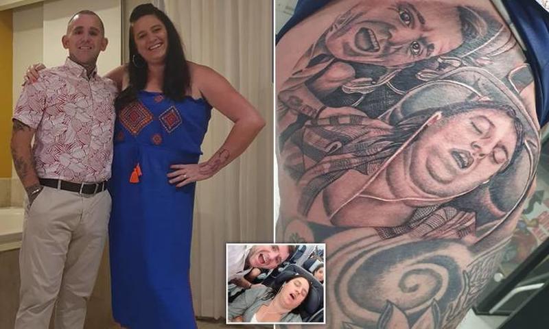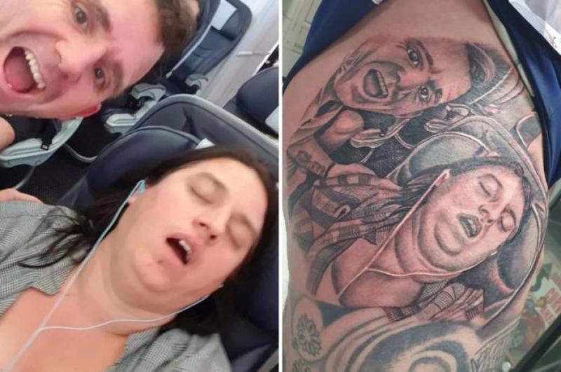 James McGraw had taken a sneaky selfie of his wife as she slept on an airplane. Her head is tilted back and her mouth open. It is not the type of picture you'd want immortalized on the internet or on someone's body. That's exactly what McGraw did. He tattooed the picture on his body. Needless to say, his wife was completely horrified.