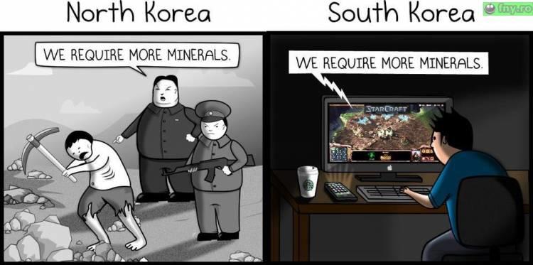 The picture above is a funny cartoon of the differences between these two Asian countries. While in the North, you go to a mine every day to get miners, in the South you have to play StarCraft II and battle the evil Zerg creatures.