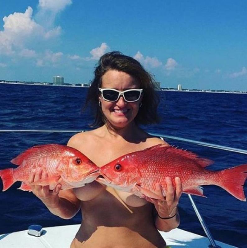 Everyone loves to get naked. And at the beach this makes a lot of sense, avoiding tan lines is ideal! This lady here is keeping with her nautical theme by holding up two fish to cover up her bare breasts. At some beaches it is even legal for women as well as men to be topless.