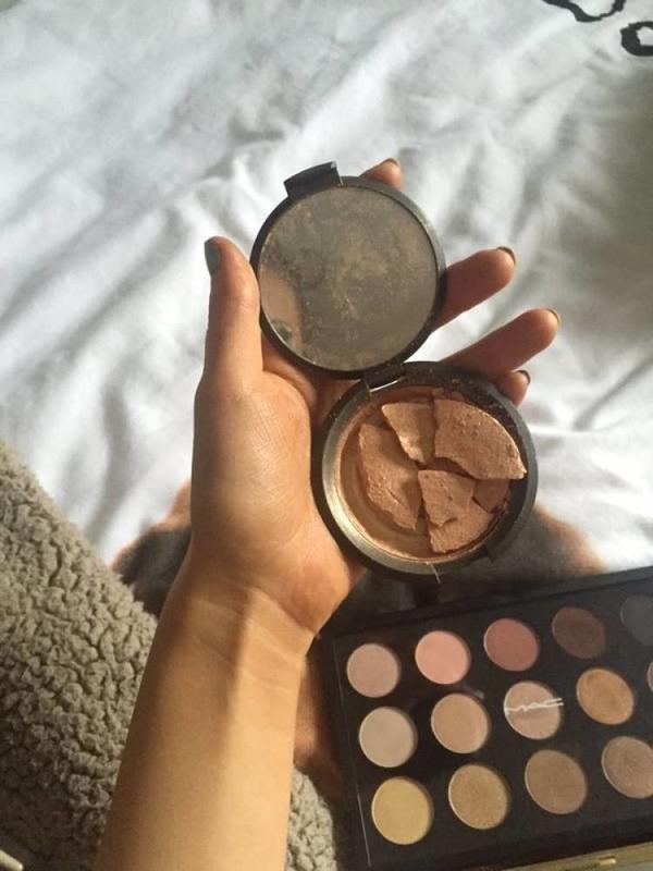 Sometimes, pieces of makeup can fall and break, or even worse situation, you can forget a piece for such a long time, that it had dried up and has cracks all over it. I'm sure the girl in the above photo can fix the problem with a little bit of water
