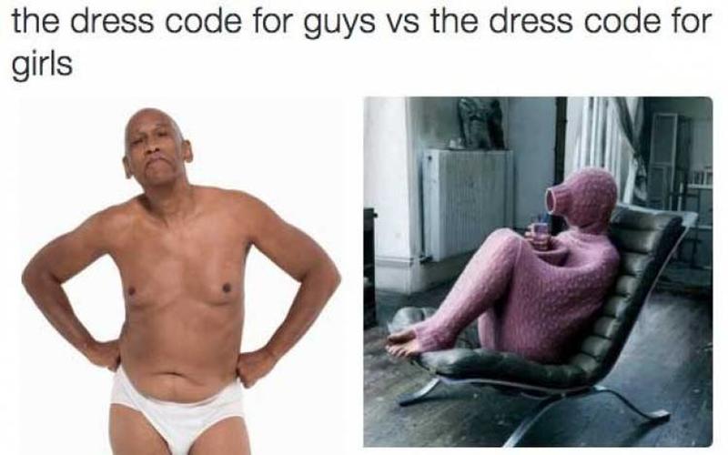 This is a funny picture. Maybe I'm not entirely getting it, but I think what it wants to say is that while guys never grow up, and can wear anything, girls have a million problems - being cold, getting menstrual pains, and having to get clothing to cope with all those problems.