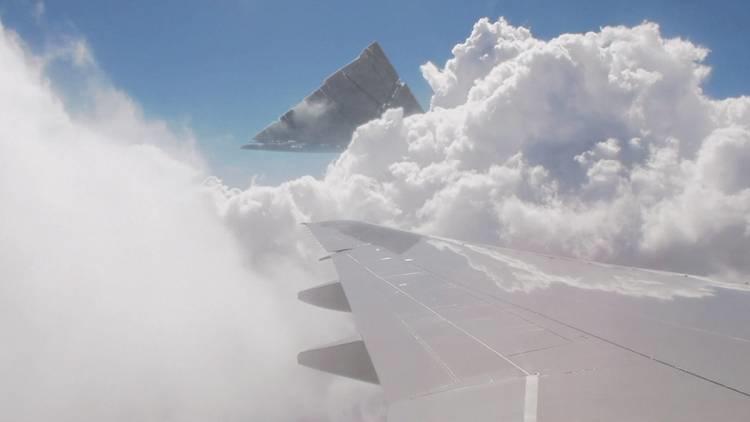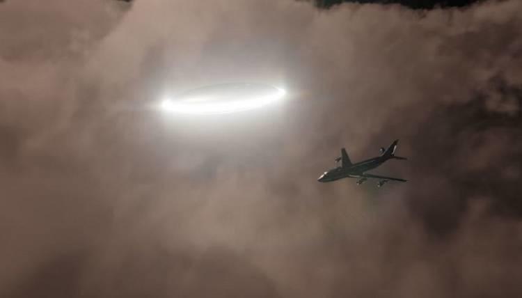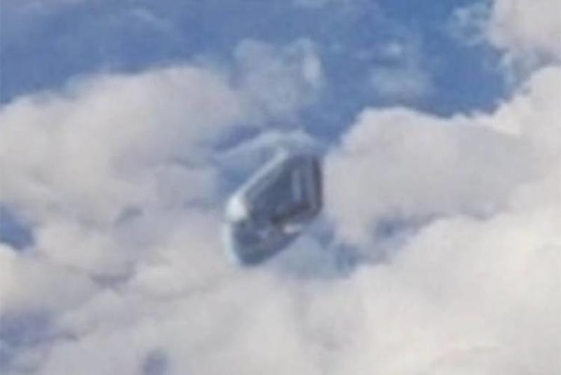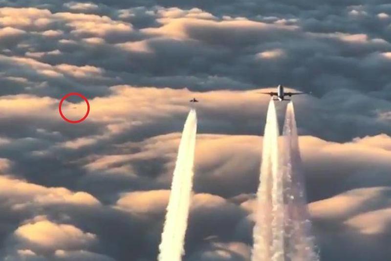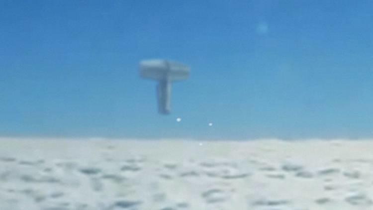 You can clearly see a weird flying metallic object, a few hundred feet below the commercial airliner. The shape is weird, it does not look like anything we have created on Earth. It flies, yet it doesn't even have wings - and it is certainly not a rocket.