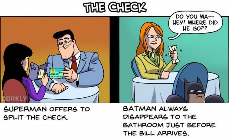 Some men would rather leech off of their partner's finances and would scram as soon as it's time to pay the bills. The cartoon compares the gentleman with superman and the broke guy with batman? Do you agree?