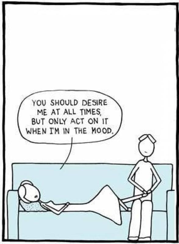 Although this comic strip represents the feelings of a woman, it goes both ways. A partner wants their better half to crave them at all times. But he should only act on his urges when she 'feel' the time is right.