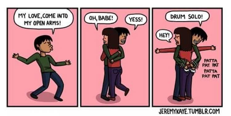 Very stereotypical of horny men. The guy just can't keep his hands to himself and gropes his partner at inappropriate places.*tap tap tap* goes the comic. Her butt is not a drum, and her breasts are not pillows.