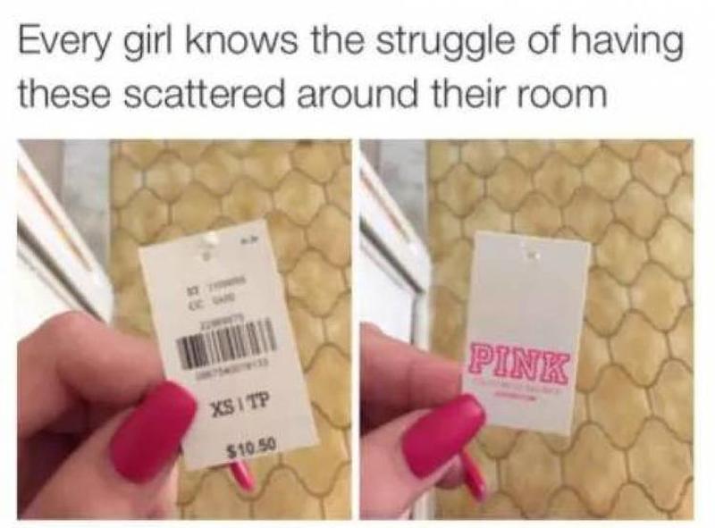 Men might not understand the frustration of buying something new and having to deal with all of the tags. Especially on new underwear, why are there so many? Not sure but you better believe a girl has her scissors ready to remove those things right away.