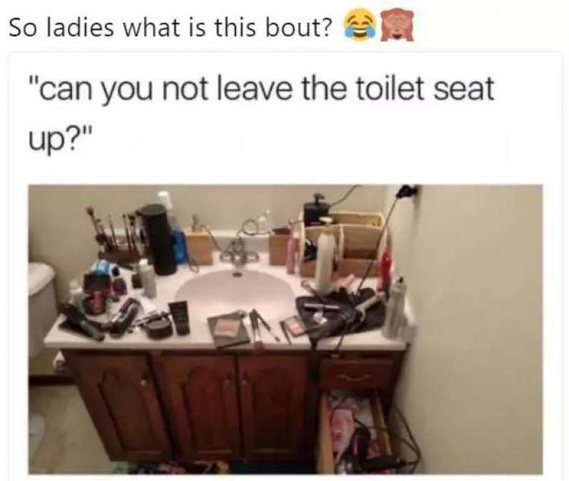 Men have to start thinking about a woman's bathroom less like it is a place to shower and pee but more like an artist studio with the canvas being our face. You think we wake up looking so perfect and flawless? It takes time and dedication and sweat and tears.