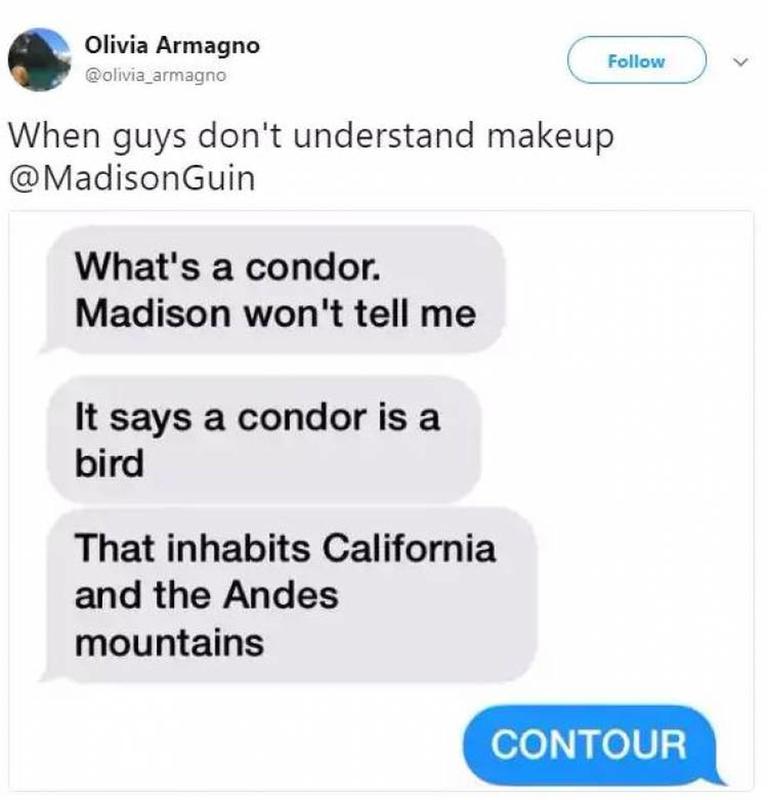 Women seem to have their own language when talking about makeup and beauty and fashion. Men will sit there and nod in agreement but often don't know what any of it means. Take notes and google the words later, or get a tutor to help you understand the language of ladies.