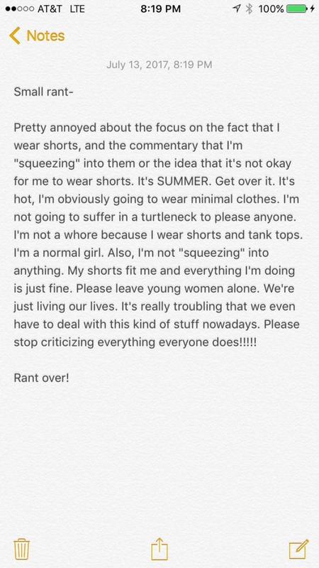 She went to twitter to go on a rant about her clothing criticism. She said that everyone needs to relax because its "summer" and she was just wearing shorts. She then goes on to say that she is not "a whore" because she was photographed with her friends wearing black shorts.