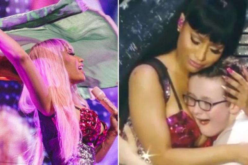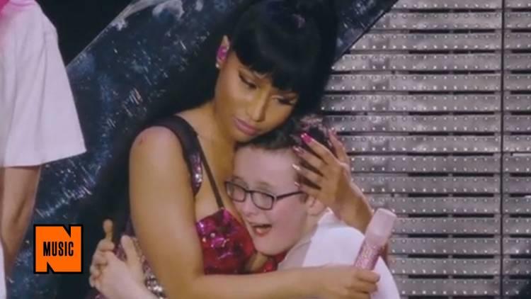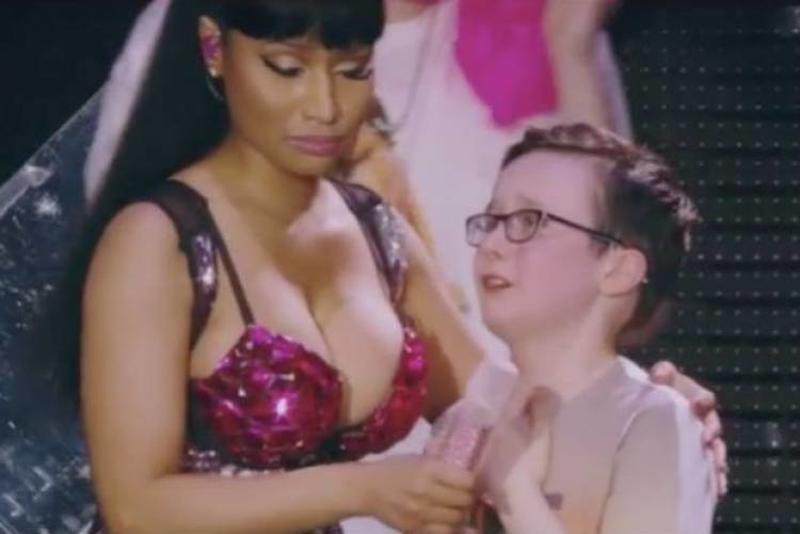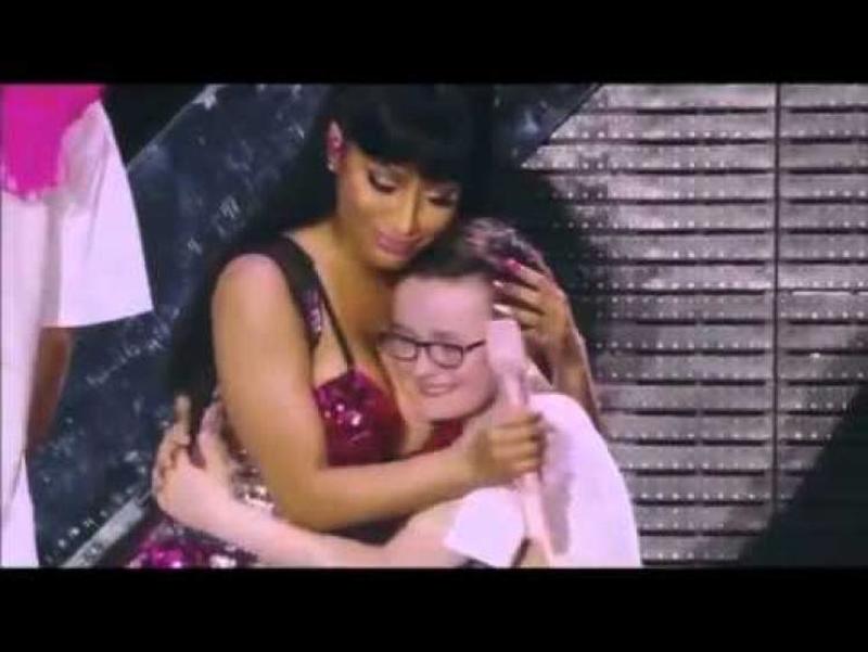 Popular musician Nicki Minaj, famous for obscure and lewd visuals in her music videos came face to face with an emotional fan boy on stage. The little boy, who was wearing round hipster silhouette frames, could not hold his tears when he saw Nicki. But Nicki knew exactly how she could turn the frown upside down. A powerful hug to her enormous chest!