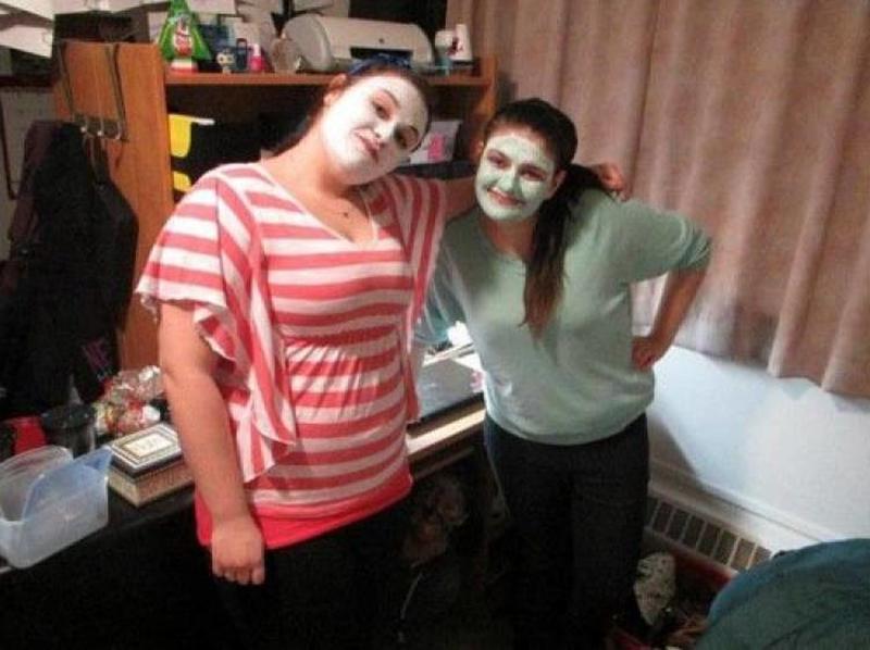 These two girls seem so happy with their slumber party masks and pajamas on. Of course, there was a third person in the room that took the picture, but you need to look closer. Do you see it? There is someone under the desk and that person has a slumber party mask on. How creepy.