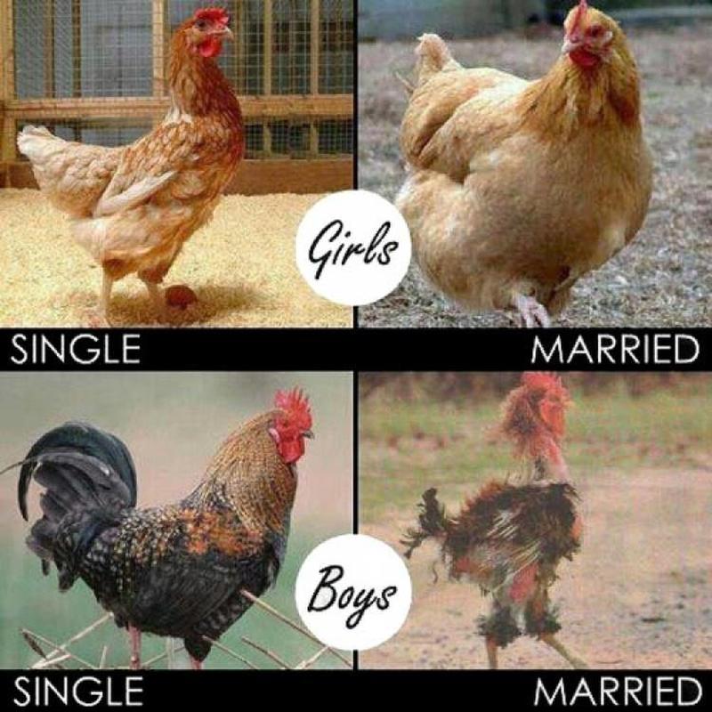 It appears animals share the same story as their human counterparts. The hen in the picture has put on a significant amount of fat while the rooster has lost all of his... and more. The poor guy's feathers are all ruffled up and gone.