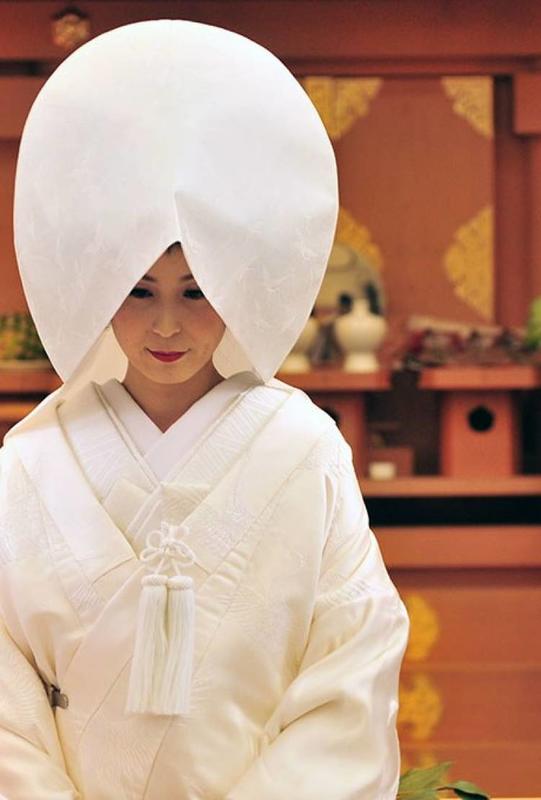 In Japan, they take the tradition of wearing white to the extreme. The bride will be covered from head to toe in white including her hood and makeup. This is to represent her "maiden status", while her hood hides her "horns of jealousy" that she feels for her mother in law.