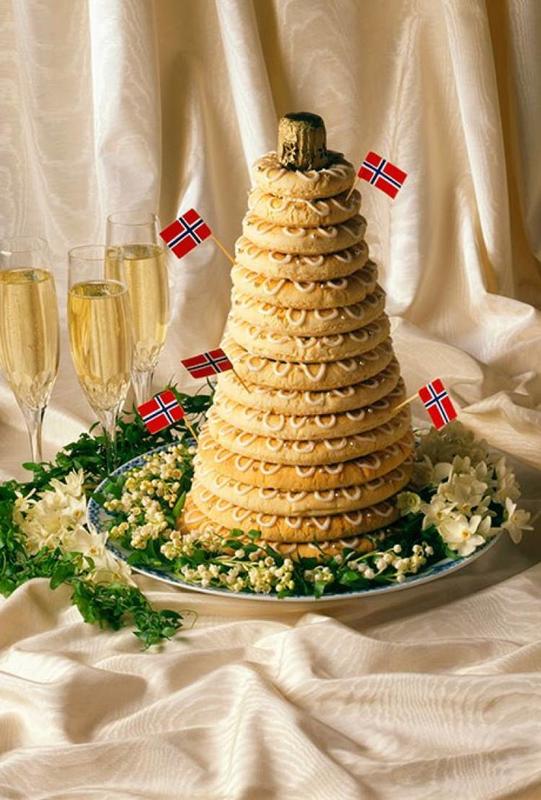 In Norway it is transitional for the bride and groom to have a traditional cake called a "kransekake" which consists of a bunch of almond cake layered rings held together with icing. A bottle of wine is placed in the hollow center for the couple to enjoy together.