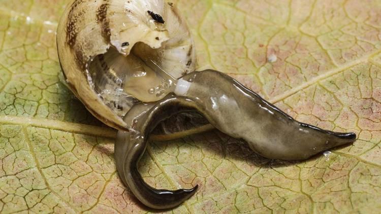 When snails detect an impending threat, they retreat their bodies inside the relatively safe confinements of their tough shells. But the flatworm latches onto a tiny opening in the shells and spits acid to dissolve the snail's flesh. Poor creatures are eaten alive!