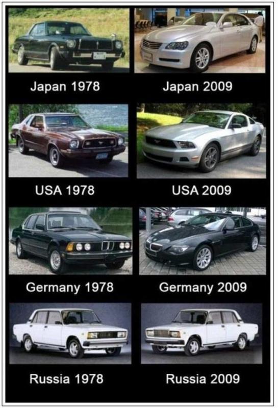 This photo might be even more hilarious than the previous one. Here, we have cars from different countries, compared how they looked in 1978, and how they looked in 2009. Everyone's car industry evolved, except for the Russian Lada which never changed.