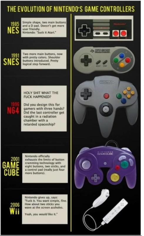 This infographic compares the evolution of console-based game controllers from the Nintendo company. Things started out fairly simple with the 1985 Nes, and reached peak complexity with the Game Cube. Things devolved back to normal with the Wii controller.