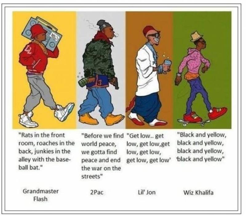Here is a satirical picture that describes to "wrong" evolution of hip-hop. You see how Grandmaster Flash started the revolution with carefully thought off lyrics and rhymes, and how that ends with Wiz Khalifa's "Black and Yellow."