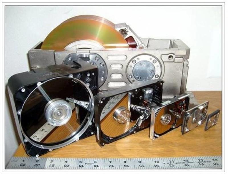In comparison to the previous two photos, we can see that hard drives had a proper evolution. Each generation got a magnitude smaller than the previous one. Comparing the first and last hard drive is almost impossible - the size difference is more than a 100 times.