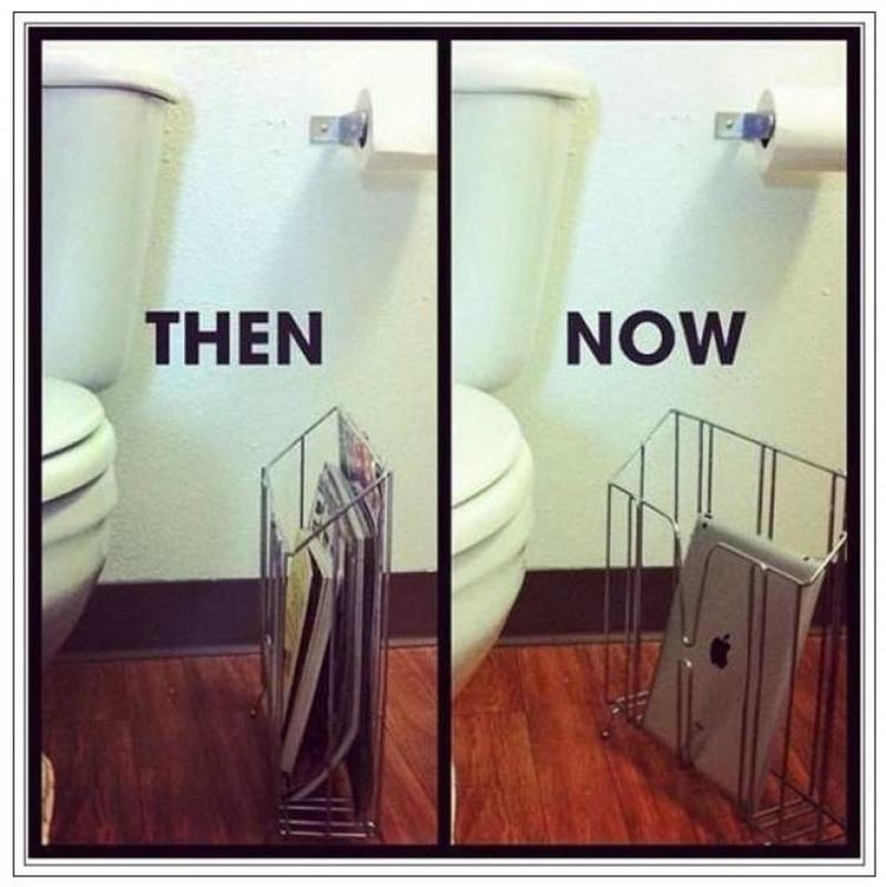 This is another photo that shows how "proper" evolution works, rather than the dreaded "devolution." While in past times, people kept newspapers around various areas of the house (like the bathroom), today tablets and phones have made newspapers an almost completely forgotten artifact.