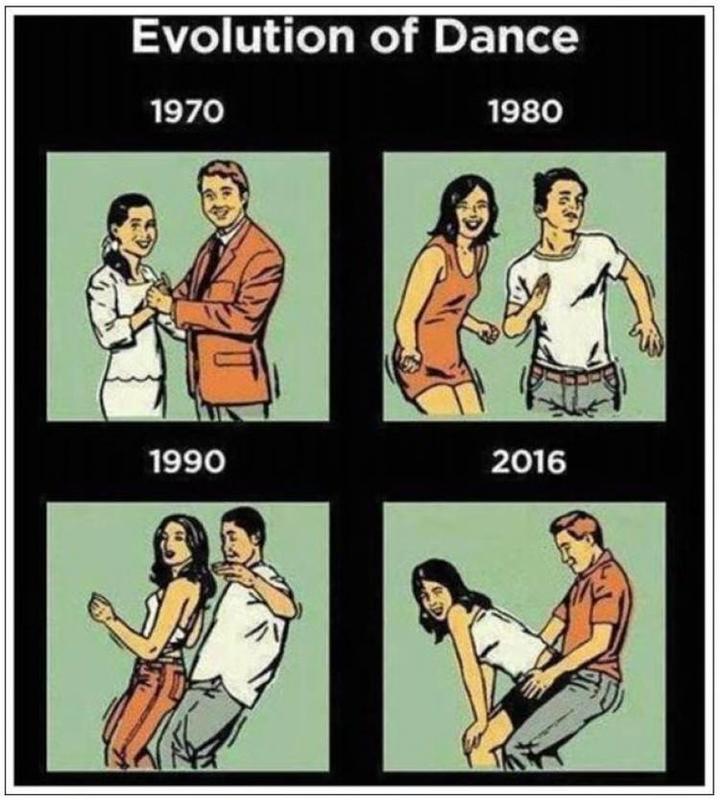 Dancing underwent a tremendous change in the past 50 or so years. While at the beginning everyone was fairly modest, the 1980s brought miniskirts and short dresses. The 1990s introduced light touching, while 2016 brought full-on "sexual simulations," AKA twerking.