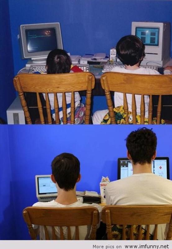 This is kind of a nostalgic photo that shows two brothers growing up by the old 1980s-style desktop computers. The two brothers grew up, their hair got thinner, but computers also changed - they became smaller, sleeker and faster.