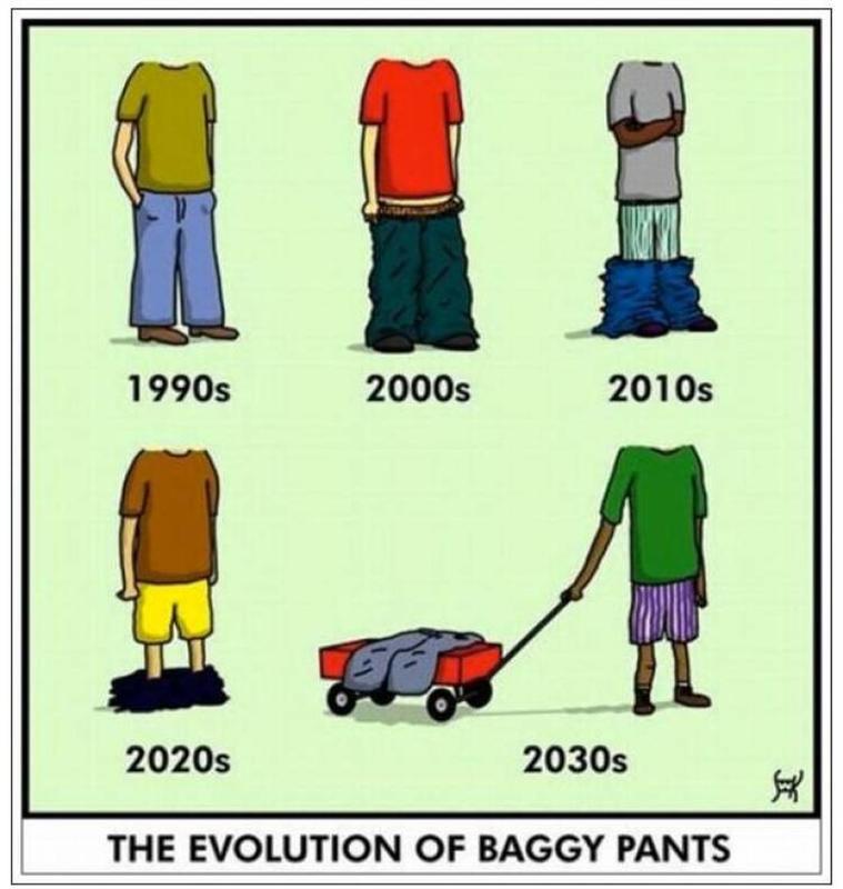 "Baggy pants," was a trend that got popular with the rise of hip-hop in mainstream culture. The first "baggers" were fairly modest to the standards of the 2000s and 2010s. We can see that in the future, rap enthusiasts are going to carry their pants on a cart.