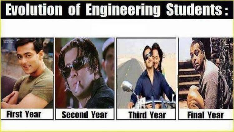Here is another interesting meme, that shows how engineering students "evolve" over time. While the first year they are all buff and happy, then they get a motorcycle and tour Europe, with finally ending up employed as meme shallow husks of their former selves.
