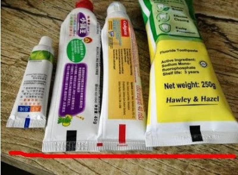 In the above photo, you can see just some of the different kinds of toothpaste color indicators. There is a red tube, a black one and a blue. They all have different meanings which will be thoroughly reviewed in the news few pictures.