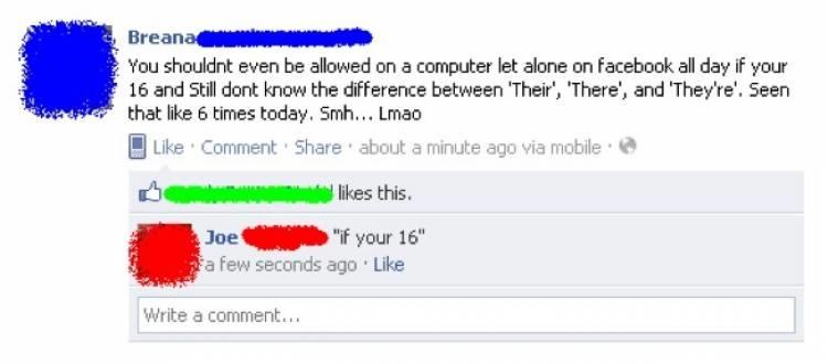 While on a tirade against people who get "their, they're, and there" wrong, this Facebook grammar nazi made the crucial error of using the wrong "your/you're." If you want to immediately look foolish, that's exactly what you do. Everyone knows you can't talk smack about something that you're doing in the exact same moment you're talking smack.
