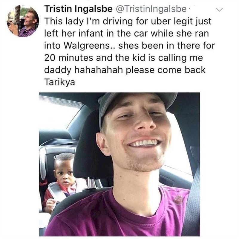 This is just wrong. You cannot just leave your kid with some random employee. I know it can feel like Uber or Lyft drivers are your friends, but they are not. In fact, they are very close to being criminals. The only reason anyone drives for those companies is because they've screwed up every other opportunity in their lives. I'm speaking from experience people, so don't get all upset with me. There's no way things are going right for you if you're driving for Lyft or Uber.