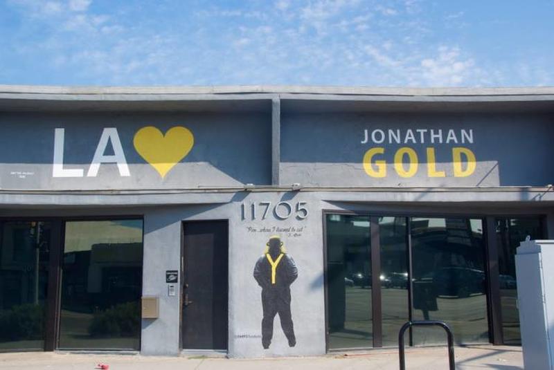 The mural depicts a rear view of Jonathan Gold in silhouette form. A quote hovers over him saying, "Pico... where i learned to eat." The main banner above it reads "LA <3 Jonathan Gold." It's a great send off to a man who truly loved the city of Los Angeles. The mural is located at Brad Metzger Restaurant Solutions on the corner of Pico and Barrington Ave.