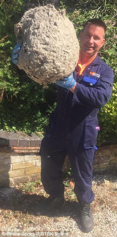 Shane Jones, 48, started his family pest control business about four years ago. He had no idea on what he was going to stumble until he was called to inspect and clean a 400-year old house in a rural British village. Inside the house's attic, he found ten of the largest wasp nests he had ever seen. He was able to remove one of the wasp nests out of the house, while the others were too big to fit through the attic hatch, meaning he had to break them into smaller pieces before removing them.